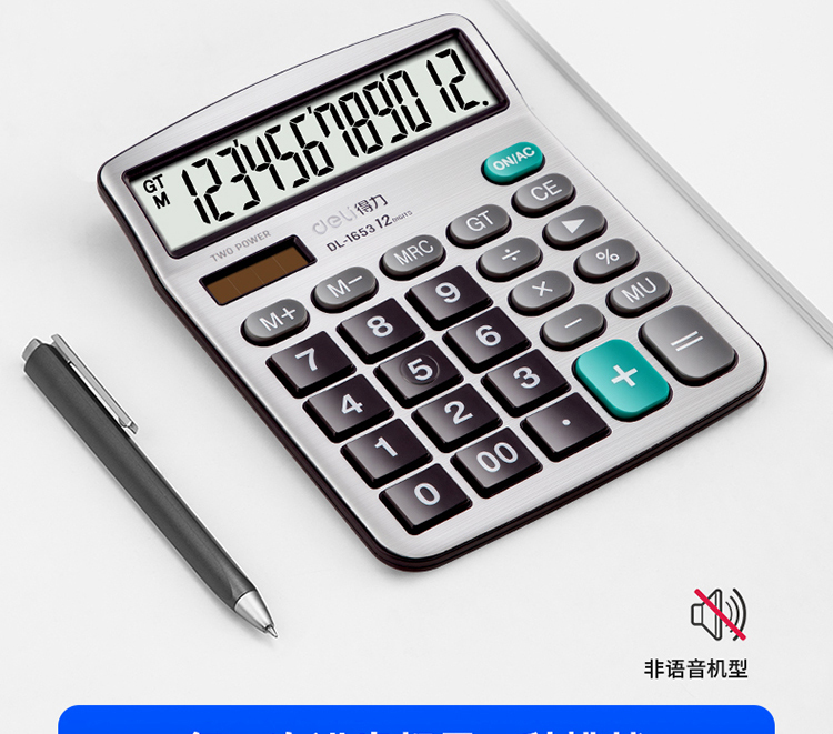 得力(deli)雙電源寬屏辦公桌面計算器 財務計算機 辦公用品 銀白色1653